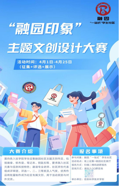 本次大赛面向各入驻学院学生,征集融园社区主题文创作品,涵盖徽章、帆布袋、笔记本、钥匙扣等多种品类!作品要求融入社区元素与信息科技特色,用创意诠释你心中的融园印象,风格不限、脑洞全开!我们将邀请专业老师、社区师生代表组成评审团,评选出一、二、三等奖及人气奖。更重磅的是:优秀作品将批量制作成社区专属文创,用于活动奖励与对外交流,让你的设计成为融园的“流动名片”,把融园故事带向更远的地方!